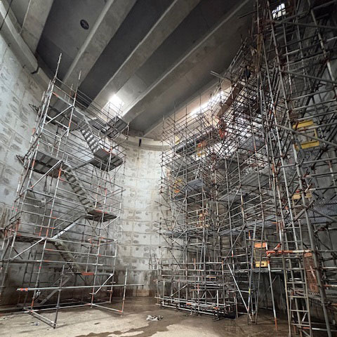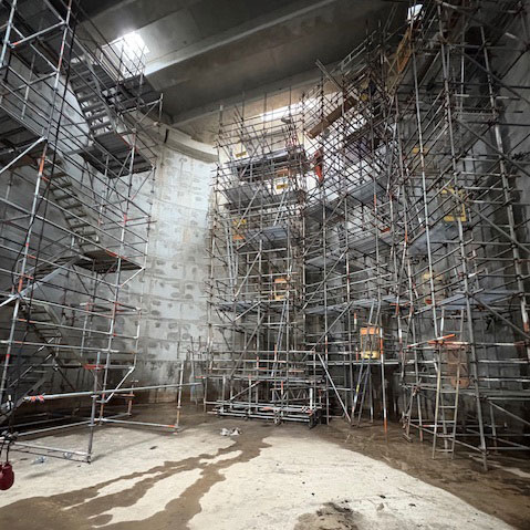 The access scaffolding is currently under construction, being designed by calculation, to facilitate the installation of pipework/pumps and associated mechanical/electrical equipment, the scaffold being boarded with bespoke open mesh gratings, to allow any seepage of storm water to flow through the decking and thus not creating additional forces and loadings onto the scaffolding.